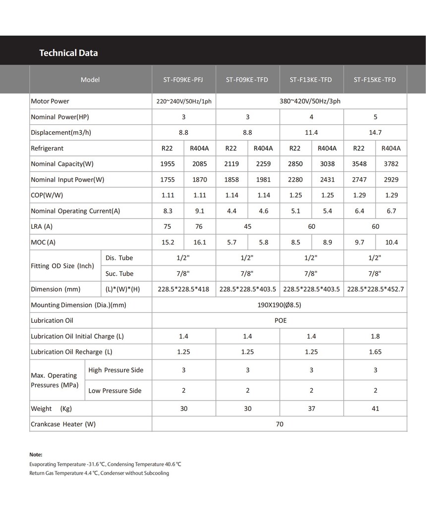 Home >> Products >>ST-F Series for Lower Temp >> ST-F Series Scroll compressor 50 HZ R404A